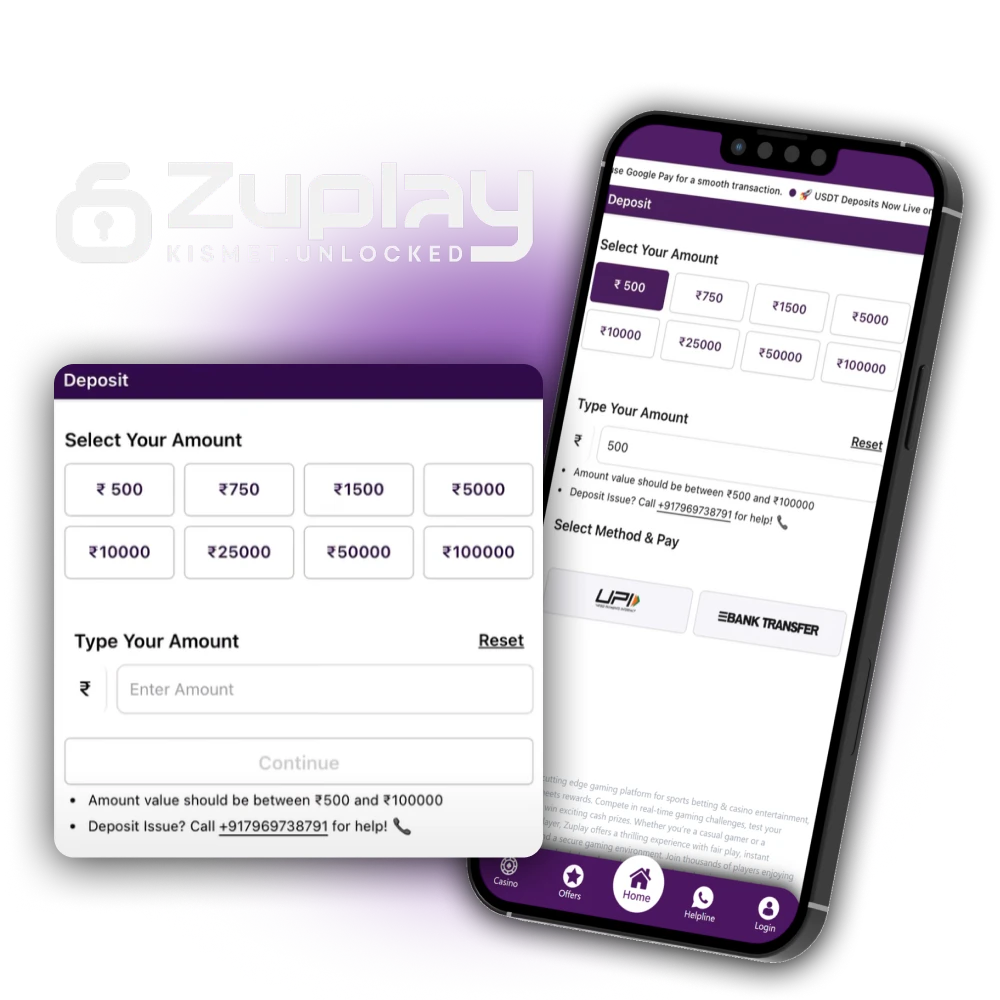 Users can deposit at Zuplay using several popular payment methods such as UPI, PhonePe, Crypto and others. Check out our step-by-step instructions to know how to make a Zuplay deposit:
